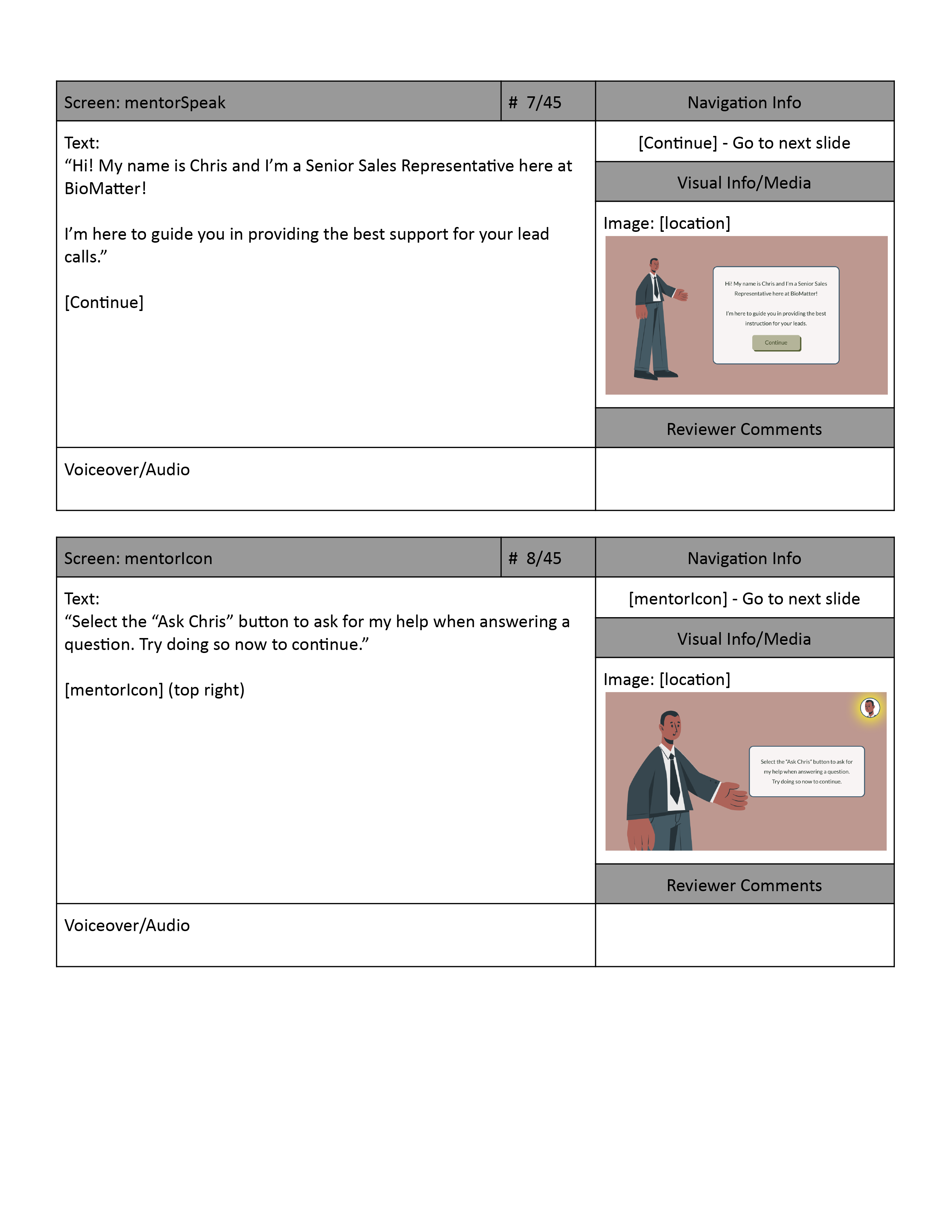 While working and receiving feedback from experts, it helped that the storyboard contained information that was clear for anyone who would be reviewing it (including SMEs, developers, and any stakeholders).This was essential part of the design process as I embedded instructional practice and learning theory to make the experience as authentic as possible for the learners.