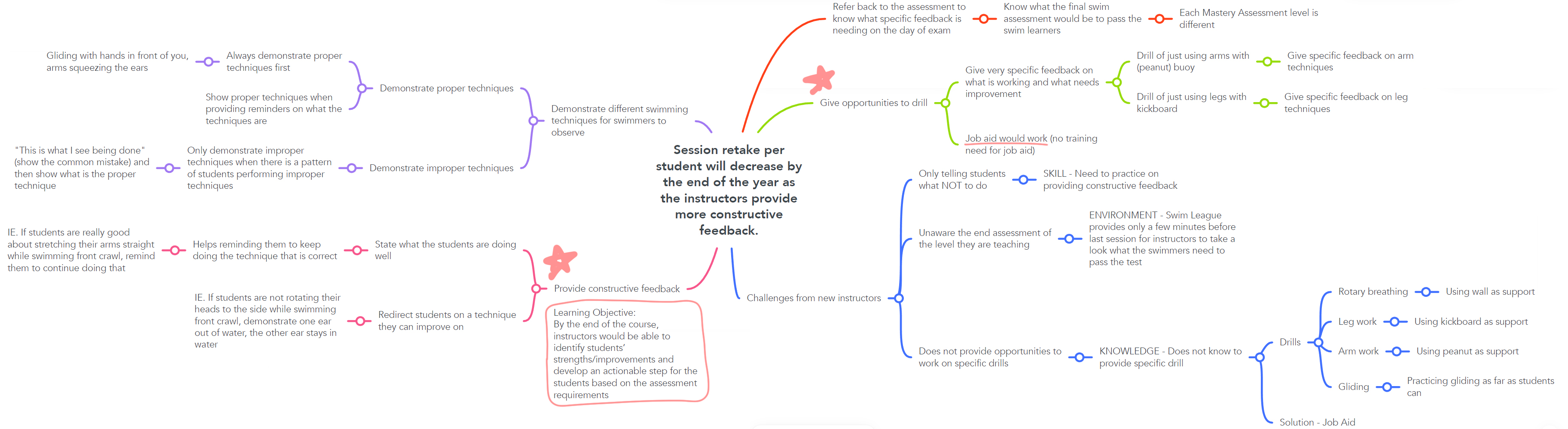 After the proposal was accepted, I acted as the Subject Matter Expert (SME) to develop an action plan suited for the results. I used Cathy Moore’s action mapping process to dissect the problem and identify any contributing factors. This would be the time I conduct interviews to understand instructors’ responsibilities, expectations, and common mistakes. All this information was captured using Mindmeister to develop an action map.
